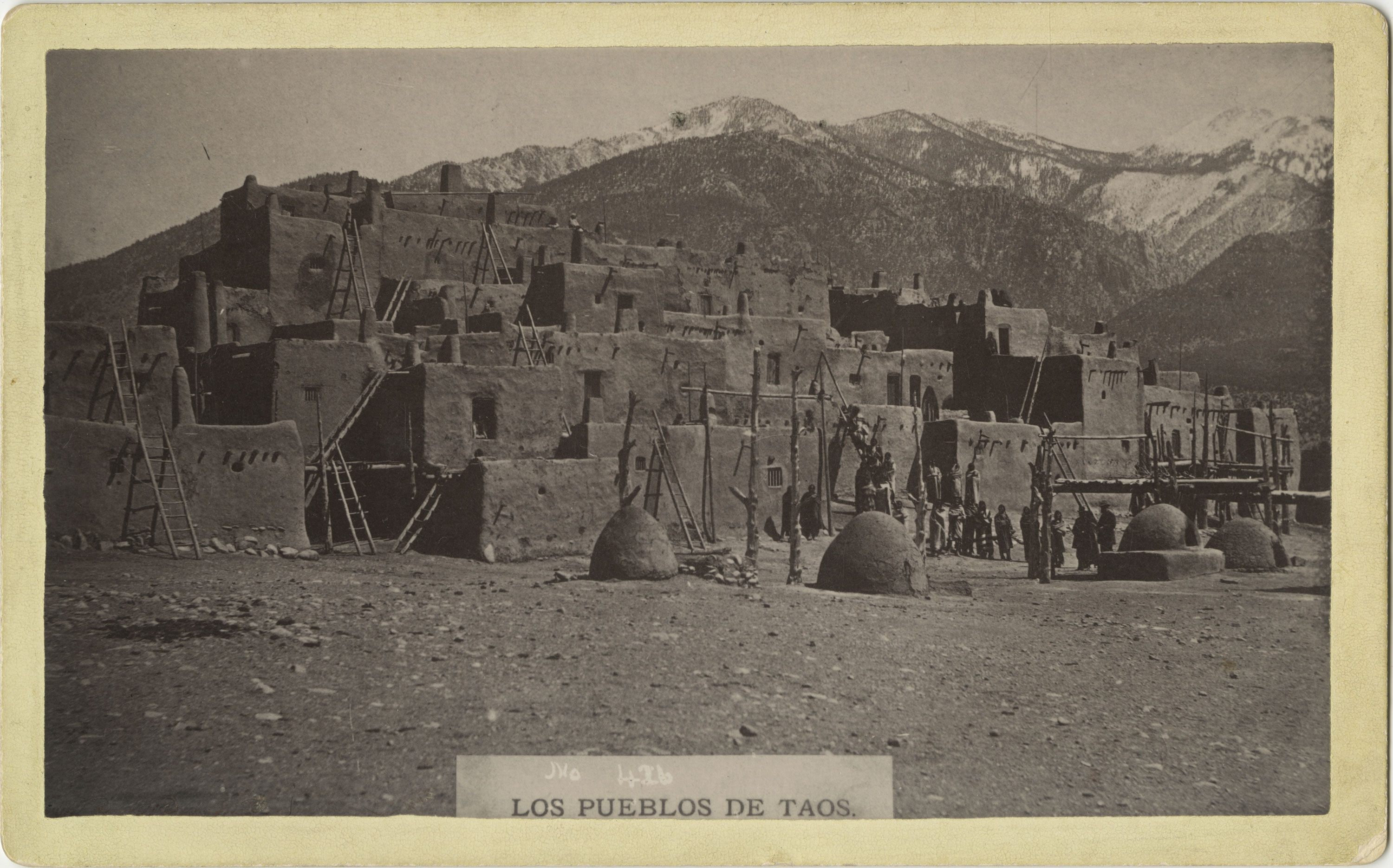 Puebloans standing next to large adobe structures, photographed in Taos Pueblo in New Mexico circa 1900-1920.
