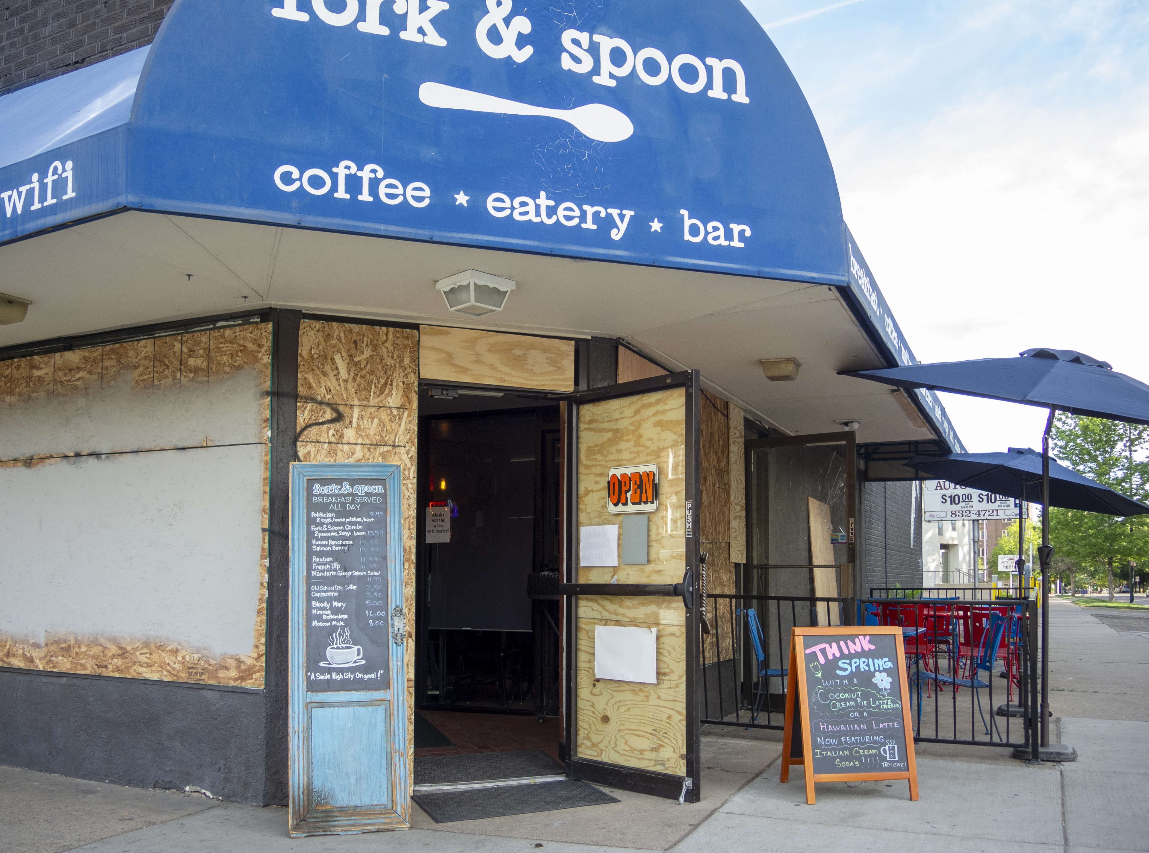 Photo of an eatery in Denver called fork & spoon. Their front door is open, but their windows are boarded up as they had been closed due to the pandemic lockdown. There are a few tables set up on the sidewalk for outdoor dining, and a sign posted inside the front door says "Masks must be worn until seated!"