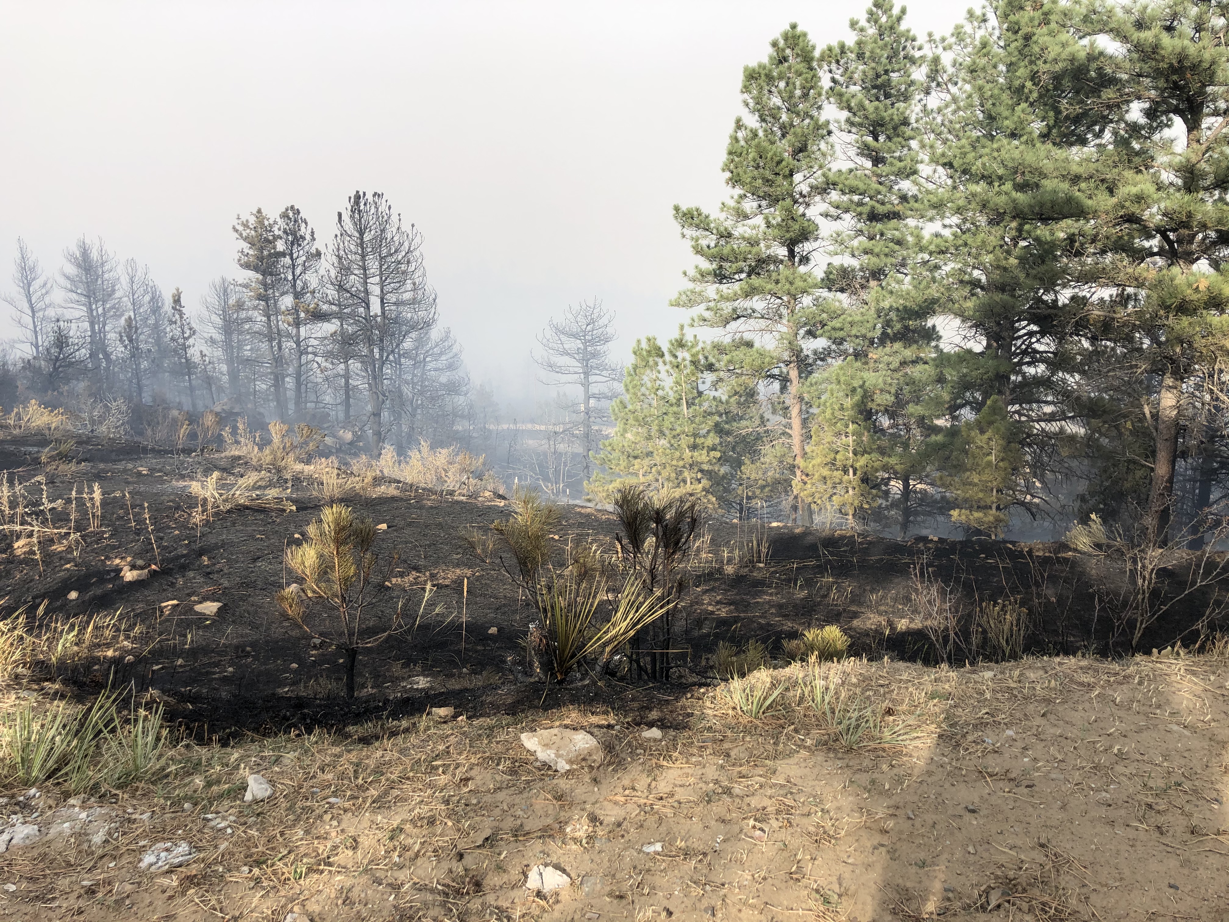 Photo of an area affected by the Cameron Peak Wildfire. In the foreground the brown soil and green vegetation turns to black, scorched earth. In the near distance, a few tall pine trees have escaped the fire and are still green and full. However further back into the distance where the ground is still smoking from the fire, the tall pines are reduced to single blackened trunks, or have branches that are also black with few, if any, pine needles remaining. The sky is filled with the hazy gray of smoke.