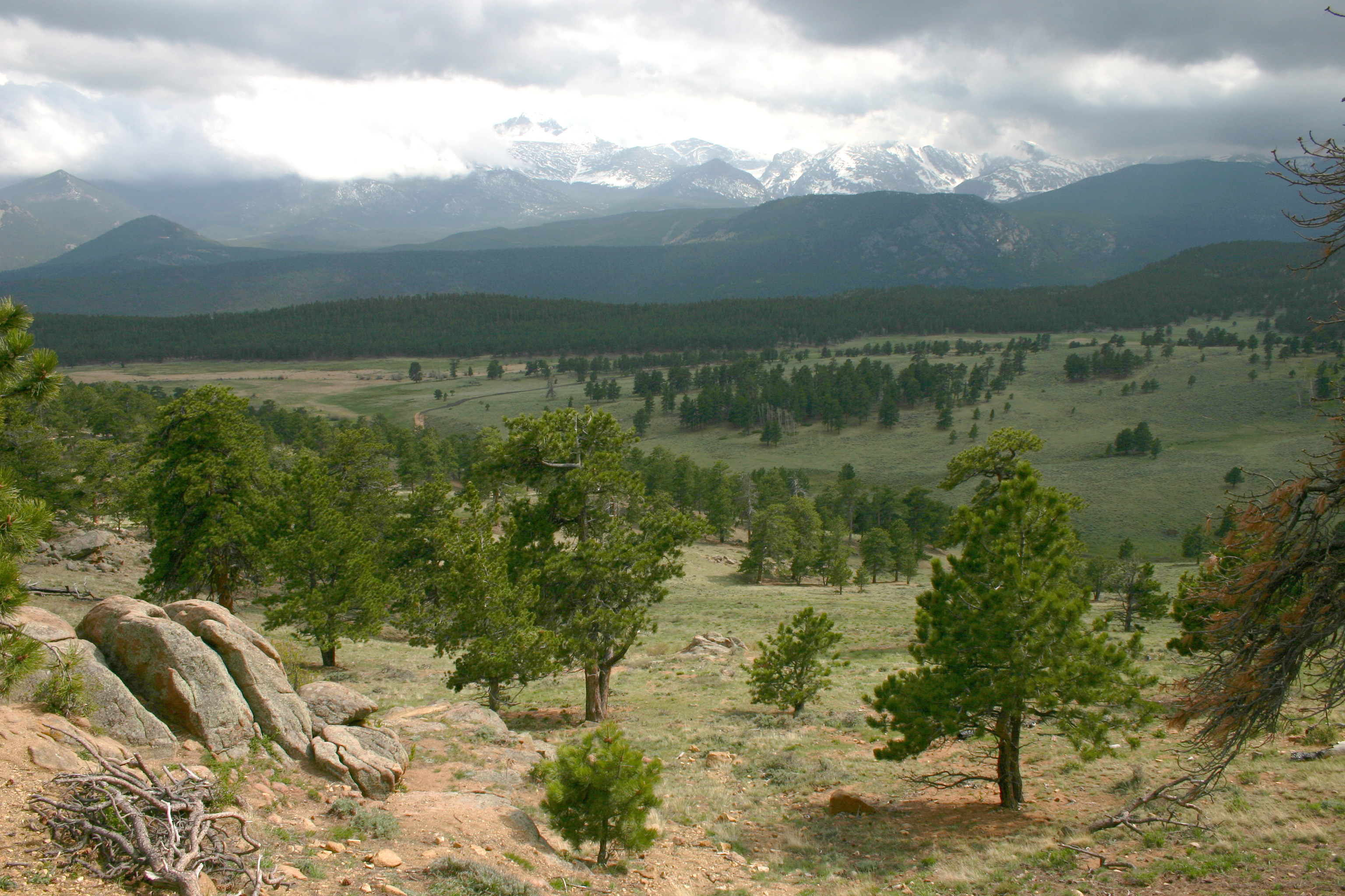 Photo of an open forest of ponderosa pines in Rocky Mountain National Forest. There are a few large boulders in the foreground, and far off along the horizon are the majestic snow-dusted peaks of the Rocky Mountains. In the valley before that, groups of ponderosa pine trees of various sizes are visible along the green and brown hills.