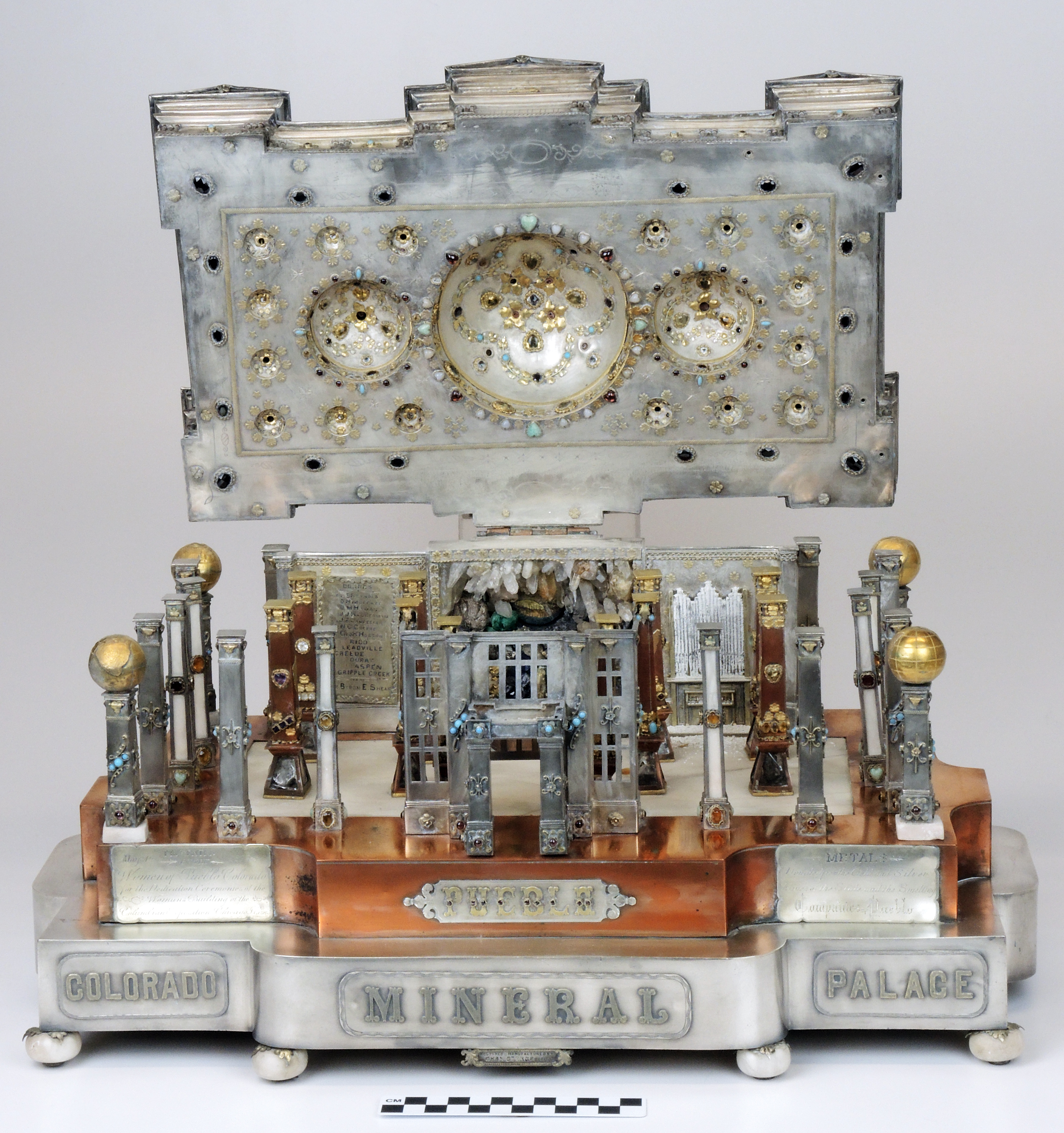 “In the center of Zoom In: The Centennial State in 100 objects is a metallic building model. It’s a scale replica of Pueblo’s Colorado Mineral Palace from 1893, by Charles Otero Jewelry Company of Pueblo. The model is made of precious metals and gemstones and was displayed at the World’s Fair in Chicago in 1893. The replica opens up and shows details such as an organ, gold ceiling and the placement of columns. The Colorado Mineral Palace was on 18th and Main Streets in Pueblo, measured 244 by 134 feet, and opened to the public on July 4, 1891 to great fanfare. The Silver Crash of 1893 made upkeep of the original building difficult, and after a devastating flood in 1921 and the Depression, the palace was in such disrepair that the building was scrapped for war material during World War II.” - Shaun Boyd, Curator of Archives, History Colorado Center