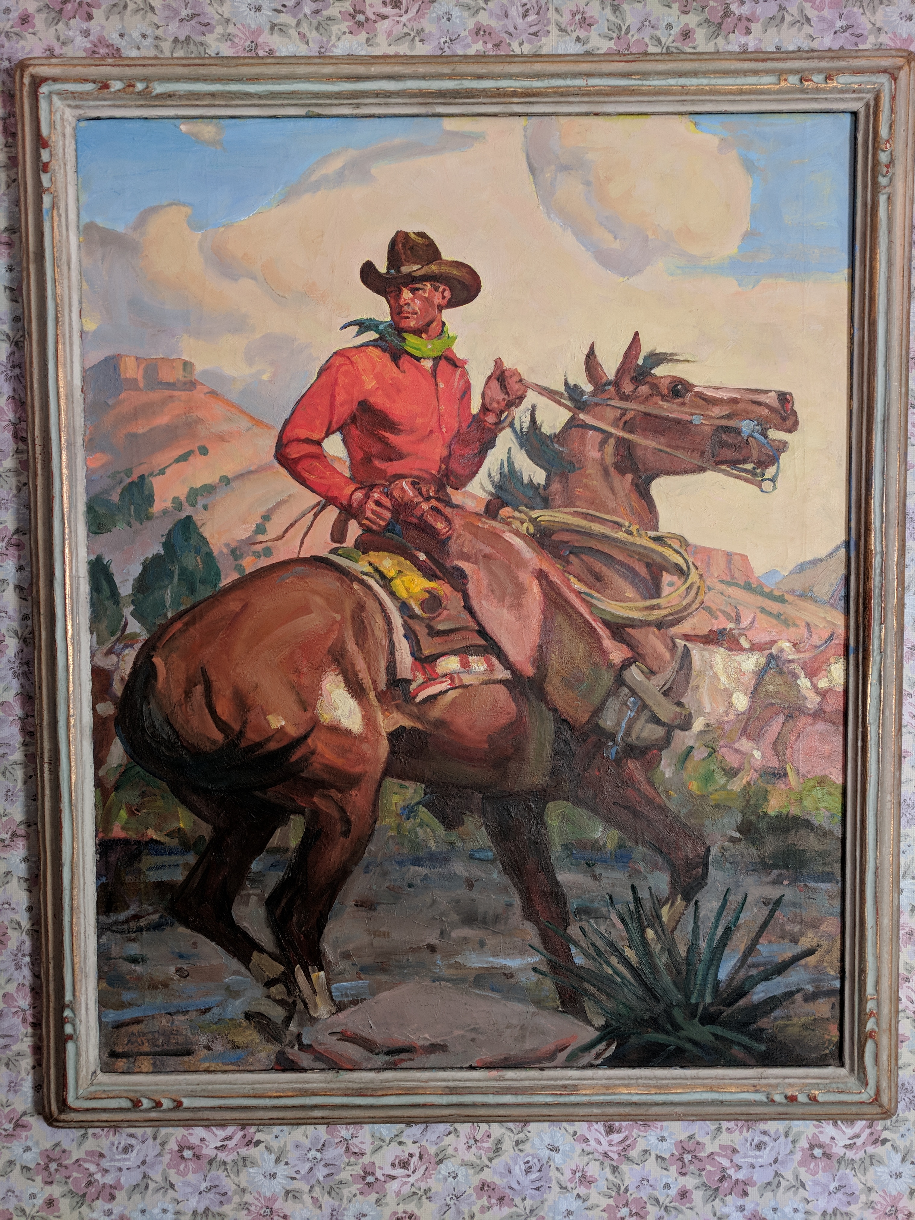"Hanging in the director's office is an original painting by A.R. Mitchell, the museum's first curator and a legacy son of Trinidad. Mitchell was as colorful a character as his paintings. He organized the purchase and opening of the Trinidad History Museum with four buildings covering a full city block. Mitchell was a cowboy who couldn't quit sketching, and he made his living as a painter. Being a forerunner in the Western Pulp art movement Mitchell made a name for himself, for Trinidad, and for the museum." - Kirby Stokes, Director, Trinidad History Museum