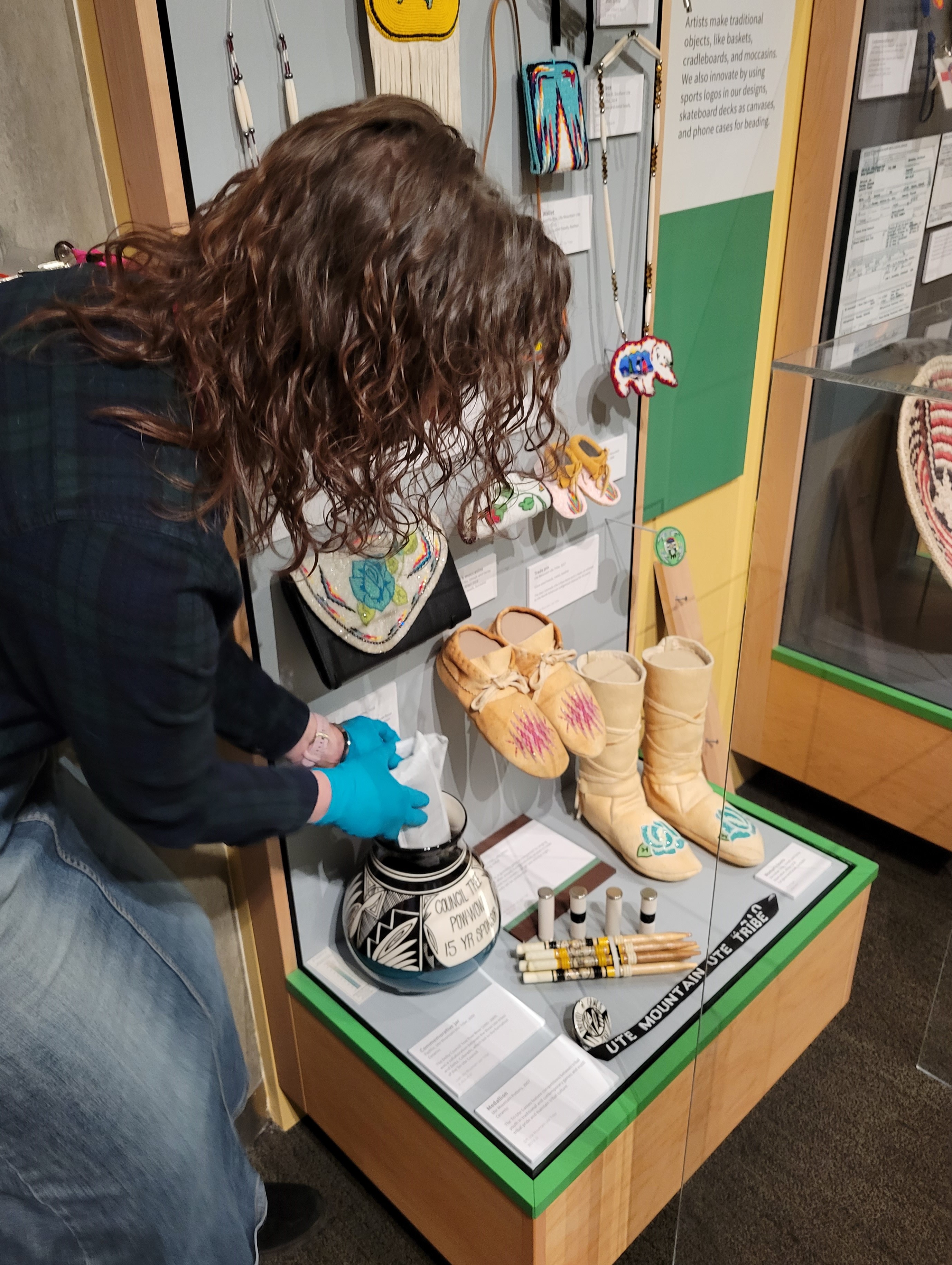 Another exhibition, Written on the Land: Ute Voices, Ute History, requires changing out baggies of activated carbon to protect important and beautiful beaded objects. The activated carbon captures air pollutants and any smells that off-gas as objects age. I like to place new packets of activated carbon (made from coconut shell husks) discreetly in the case and then throw away the old packets with all the captured pollutants.