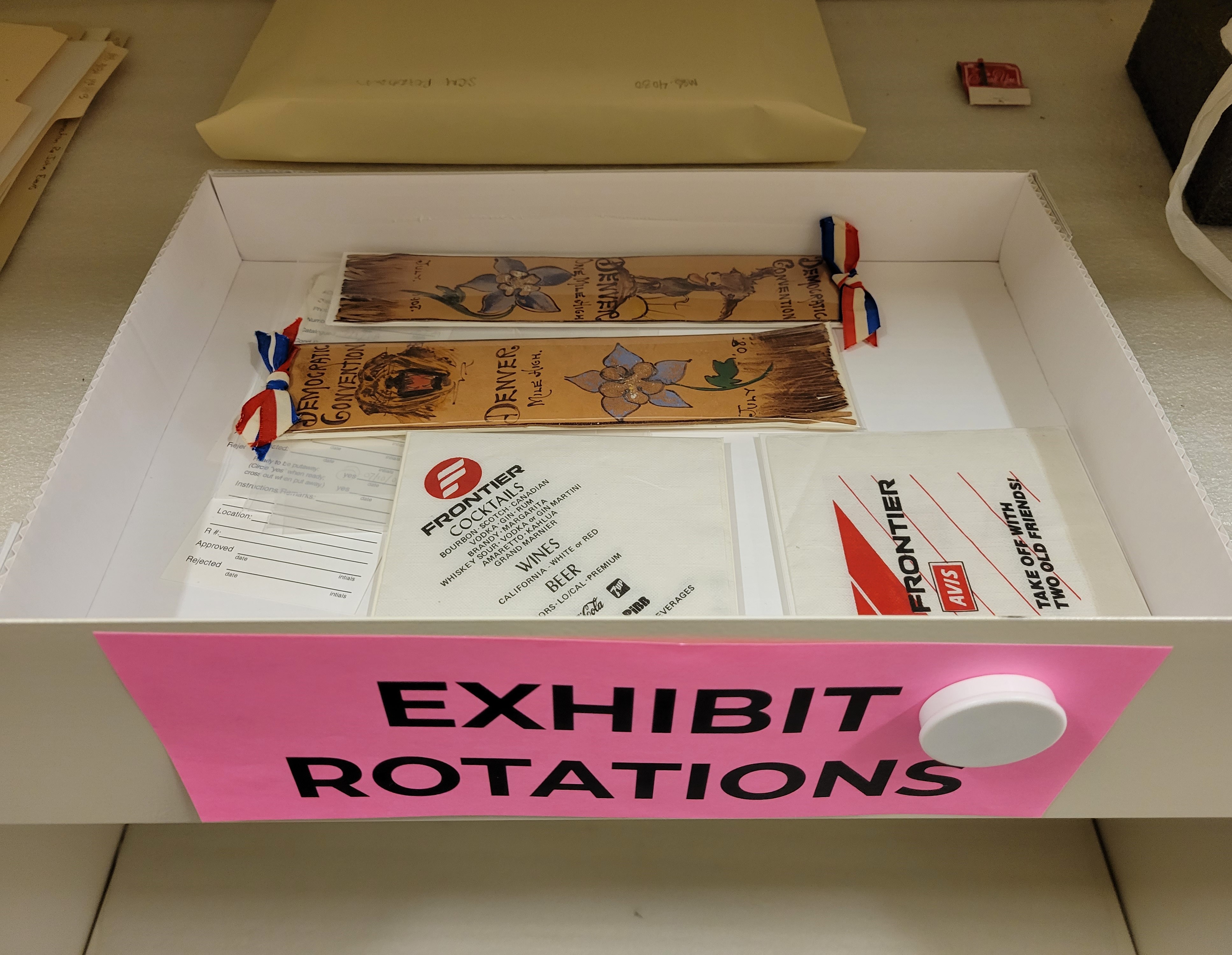 Some items are particularly prone to light damage or changes in humidity or temperature. These objects are staged in our museum’s secure, climate-controlled collection storage vault. For example, in the History Colorado Center exhibition Zoom In, a Democratic Party Convention Ribbon (2017.37.2) and a Frontier Airlines napkin (83.364.22) are changed out with other examples to prevent the colored ink from fading.