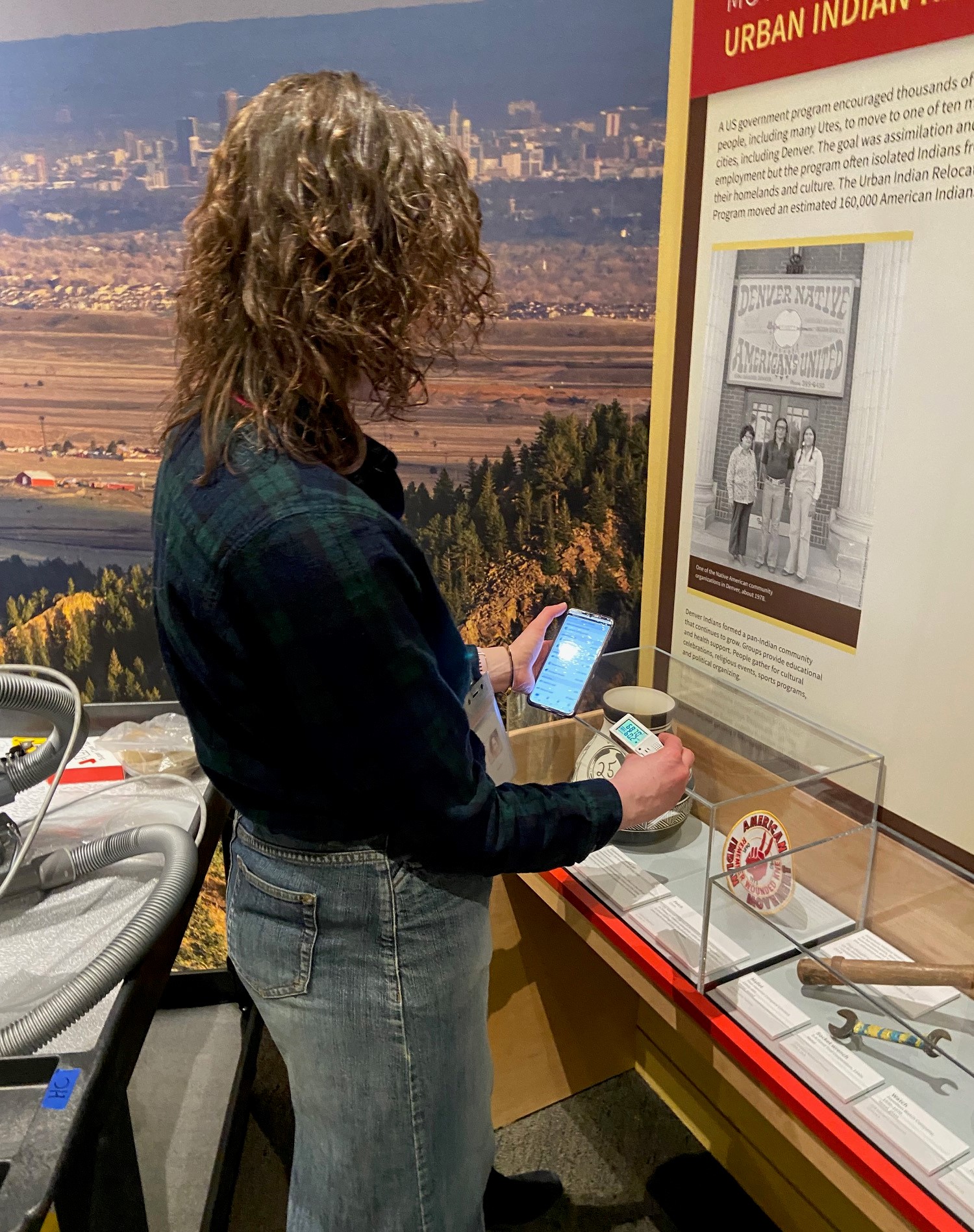 One final activity I regularly complete is checking the environmental data-loggers scattered throughout all of our exhibition spaces at the Center. Each logger’s data is wirelessly uploaded to my phone, and History Colorado staff monitor and track environmental data like relative humidity and temperature to ensure the HVAC system is stable and the objects are preserved in the best possible condition. Since abrupt fluctuations cause objects to crack or tear, a reliable temperature and relative humidity keep the objects safe and in their optimal condition for visitors well after an exhibition is open.