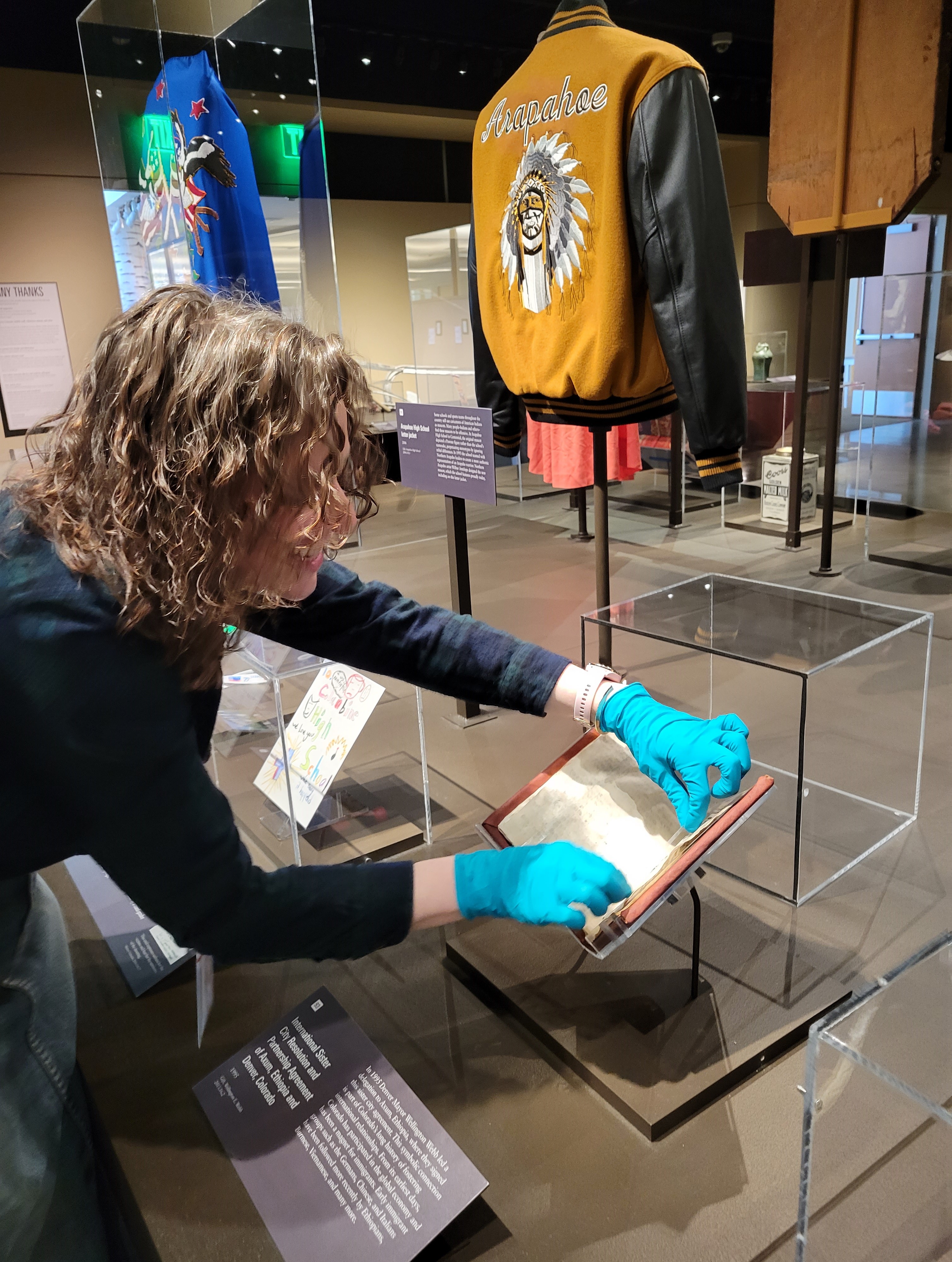 For example, within the Zoom In: The Centennial State in 100 Objects exhibition on the third floor of the History Colorado Center, I change the pages visitors see on view. My job is to remove the protective plexiglass cases and flip to the next page in all of our paper documents, including the International Sister City Resolution and Partnership Agreement of Axum, Ethiopia and Denver, Colorado (2003.16.2); the Colorado State Constitution (IL.2017.17); and the Bent family bible (H.103.1).
