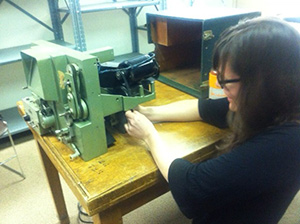 Last week, Photo Archivist Emily Moazami and I started learning the ins and outs (literally) of the Moviola. Our first attempt to play a reel of 16mm film on the machine ended with us scratching our heads in dismay: though the motor chugged loudly, the reel failed to advance. We flipped switches, checked fuses, and loaded and reloaded the reel, all to no avail. Finally, with some trepidation, we decided to think “inside the box” – and pulled off the exterior case for a look at the Moviola’s innards. And there we found the problems: a slipped belt and a motor that had jostled loose from its footings. One screwdriver, two greasy hands, and several high-fives later, the Moviola was running like a dream. And we sat down to proudly watch our first films reel by on the tiny screen.