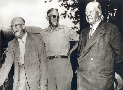 President Eisenhower, Carl Norgren, and President Hoover enjoy a delightful rendezvous at Byers Peak Ranch, also known as the Western White House, circa 1954.