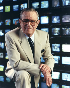 Bill Daniels in front of multiple video screens; cover shot for Relentless book, 1990s.
