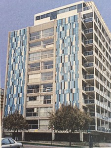 North face of 888 Logan Street. Mosaic tile was replaced by stucco in 1999.
