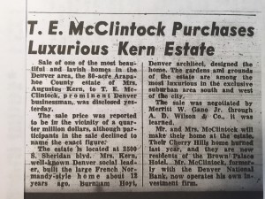 A 1946 Rocky Mountain News article says that McClintock was formerly with the Denver National Bank, but now operated his own investment firm. That year he paid a reported $250,000 ($3.2 million in 2015 dollars) for a house, designed by Burnham Hoyt, and 80-acre estate at 2500 S. Sheridan Boulevard. Their Cherry Hills home having burned the previous year, he and his wife were living at the Brown Palace Hotel. Today the 80 acres (equivalent to 16 Denver city blocks) are filled with over 100 homes, two churches, and a daycare center. He must have owned mineral rights in Weld County, as there are several 2014 references on the internet regarding royalty payments to the T.E. McClintock Trust for the benefit of his daughters Mary and Elizabeth.  (Apartment 11D)