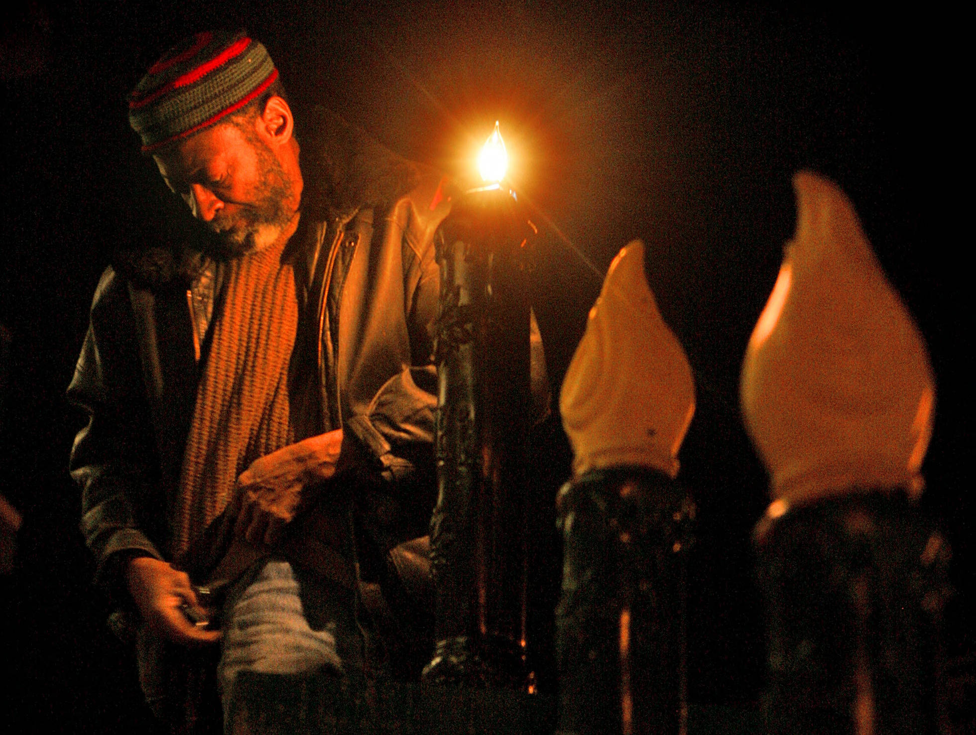 Denver local Irvin Wheeler tests the bulbs on an 8 ft Kinara for the lighting of the first candle of Kwanzaa in Denver's historic Five Points district, Dec. 26, 2006.