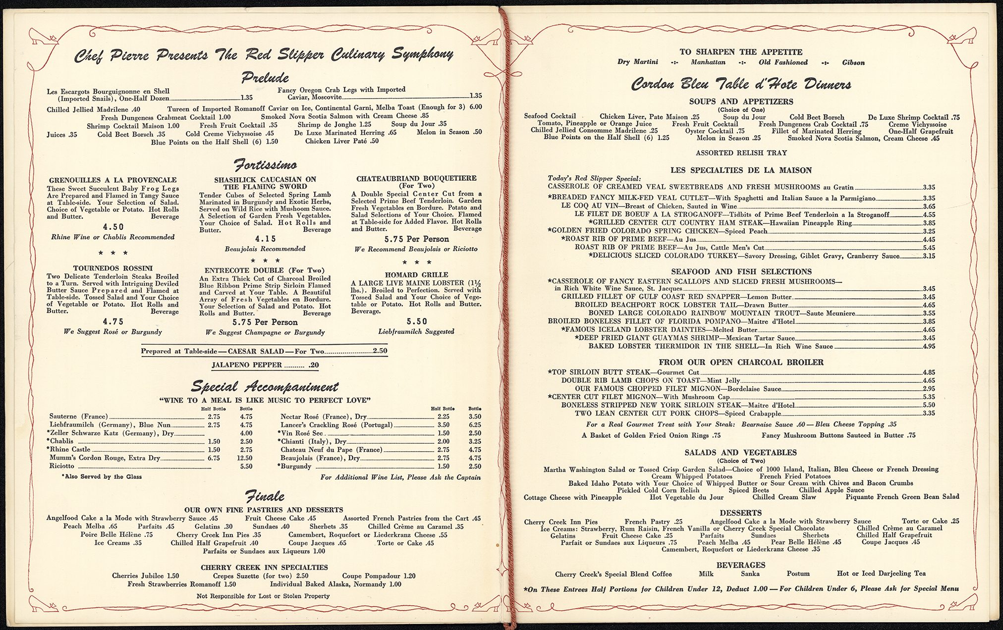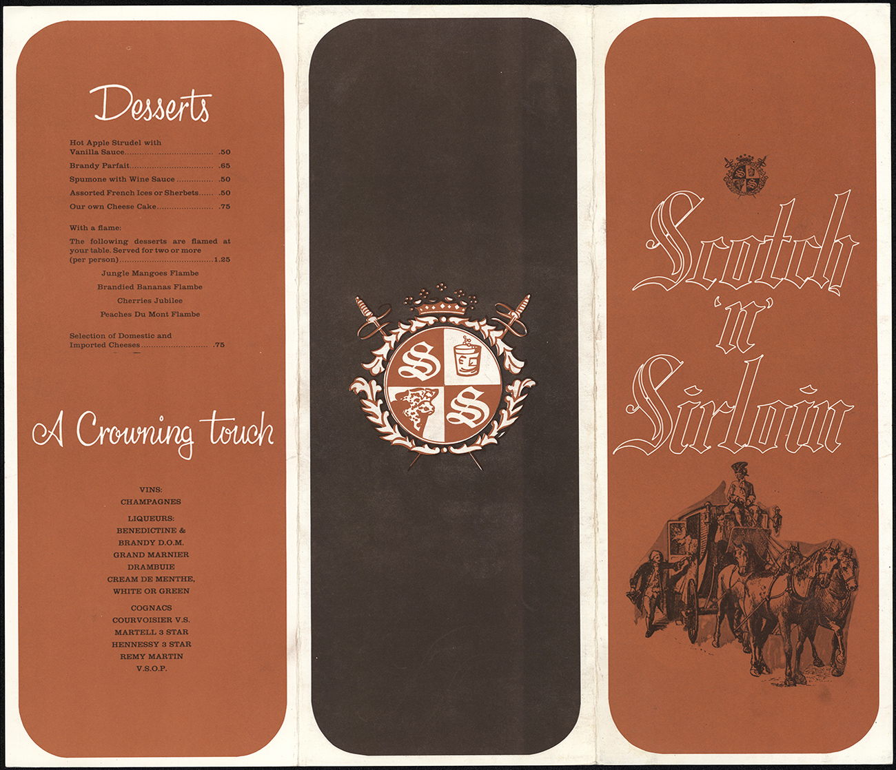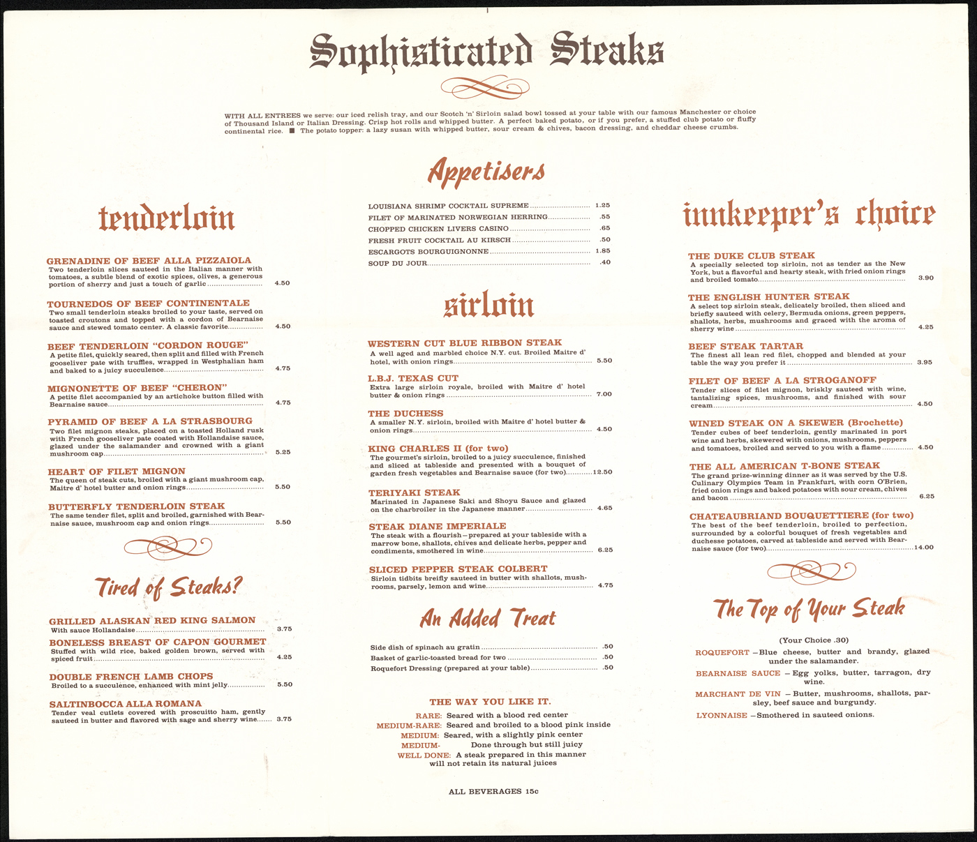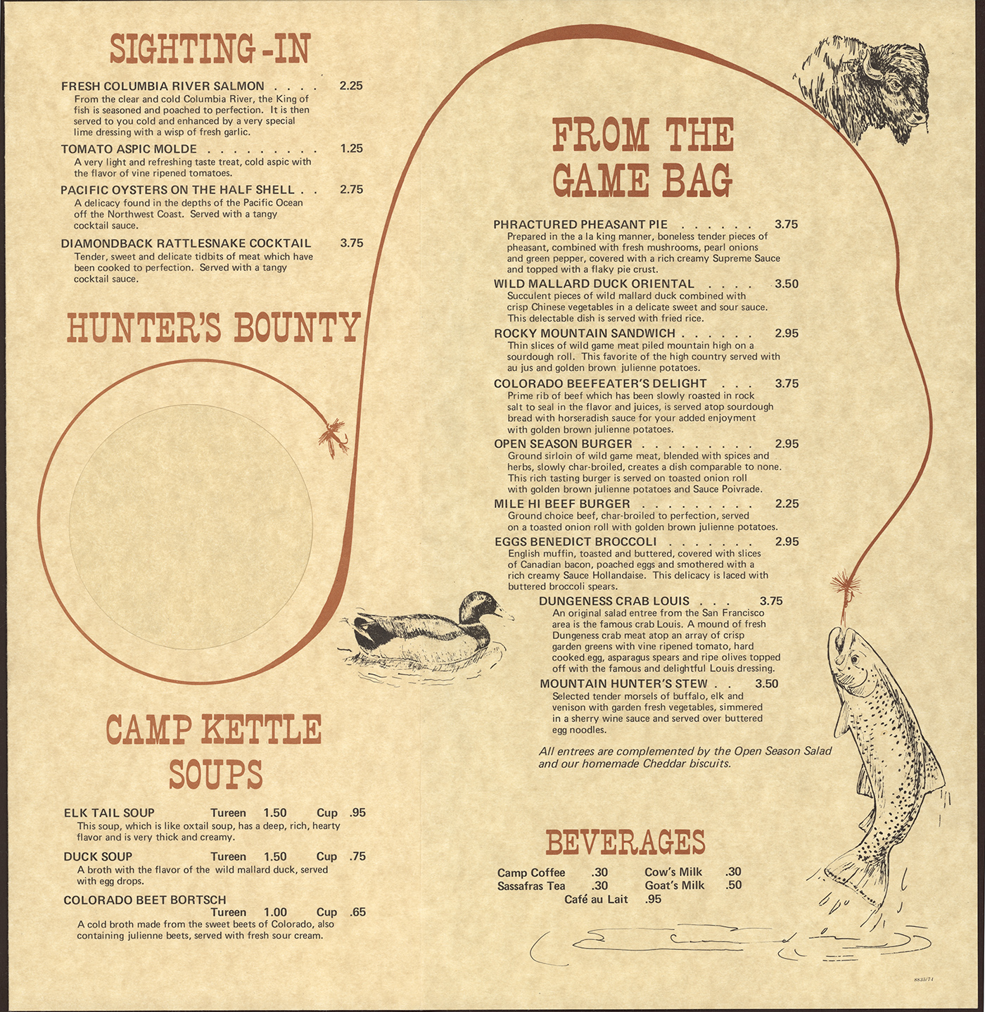 And finally, menus sometimes just tell it like it is. For much of Denver’s history, beef was what was for dinner. Not just beef, but, to be more specific, steak. The love of a nice slab of steak is documented in the Manhattan’s 1920s list of available cuts for which they were famous. In the 1970s, Scotch & Sirloin’s listed steak 21 different ways, including the unusual “Grenadine of Beef Alla Pizzaiola.” Scotch & Sirloin’s menu actually contains a section entitled “Tired of Steaks?” which features a paltry four dishes of salmon, lamb, veal and capon (rooster).