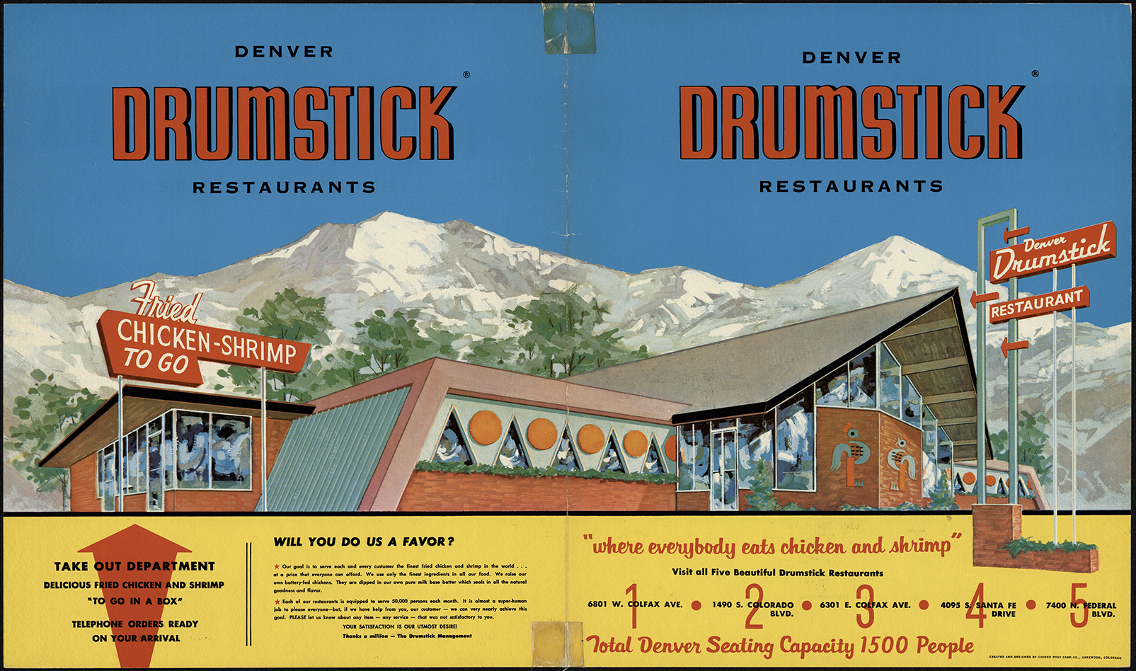The authors of this lovely book dedicated significant time to researching our menu and photography collections, veritable gold mines of information about eating establishments past. Our menu collection in particular is somewhat underutilized, and it’s a fascinating trove of about ten linear feet of menus from around the Front Range, dating largely from the 1920s through the 1990s. The bulk of the materials fall between the 1960s and ’90s, and they document local favorites of both high and low cuisine, from the Denver Drumstick to the Red Slipper.