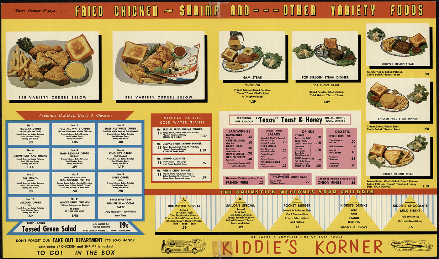 Like a parent proudly marking off a child’s height against a wall, perusing the menu collection offers a foodie researcher innumerable hatch marks demonstrating the evolution of Denver food culture. These ephemeral documents serve as tools for culinary nostalgia, and for better understanding the history of our town. The book Lost Restaurants of Denver offers a guided tour through the highlights of this advancement. Both the book and the menu collection are freely available for viewing by the public in our Library & Research Center, Wednesday through Saturday during museum hours, no appointment necessary. To plan a visit, see our webpage.