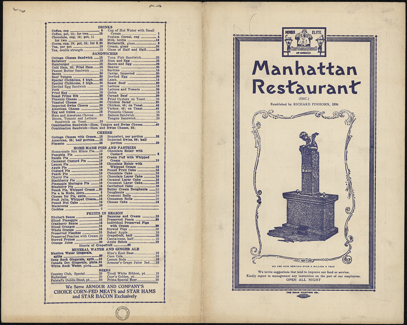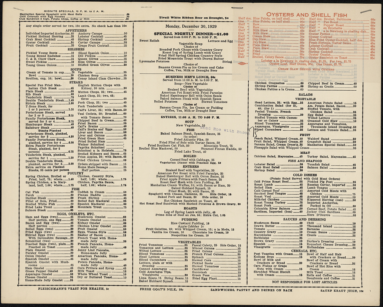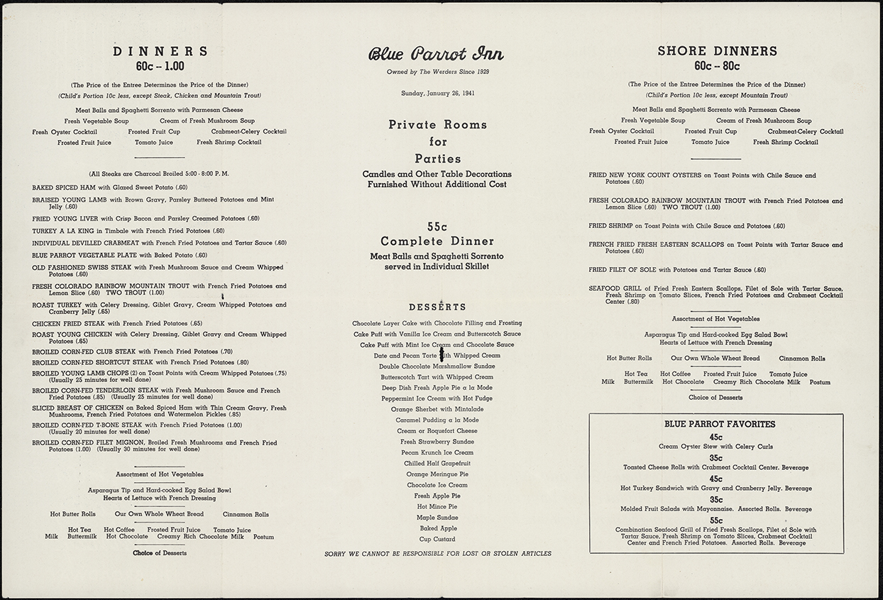 Well, as you examine menus from decades past, patterns emerge. What we eat says a lot about who we are, and how that changes over time. Our culinary tastes are shaped by the local food distribution networks and which ingredients are available—for example, can you imagine what it would take to ship oysters to Colorado in the 1880s? Pell’s Oyster House managed that feat eight months out of the year by shipping live oysters via train in vats of ice water. Fortunately, we’re not dependent upon such arduous methods any longer!