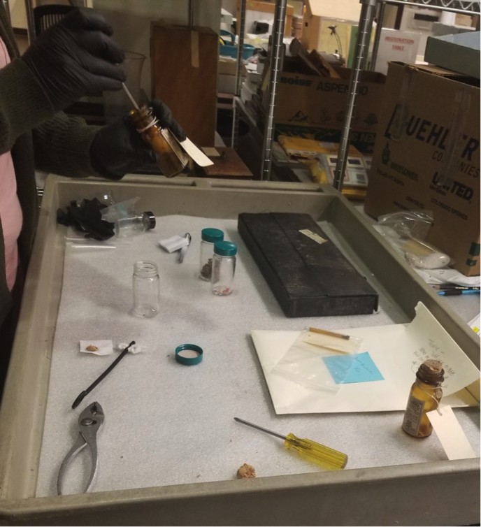 I had to carefully remove the corks on the bottles for accessing the tablets. On one of the bottles the cork easily came off. Unfortunately for the second bottle, the cork was deteriorating to the point that it crumbled. The DEA agents came prepared to History Colorado with vials to transfer the tablets. The image below shows an agent carefully filling a vial with the substances.
