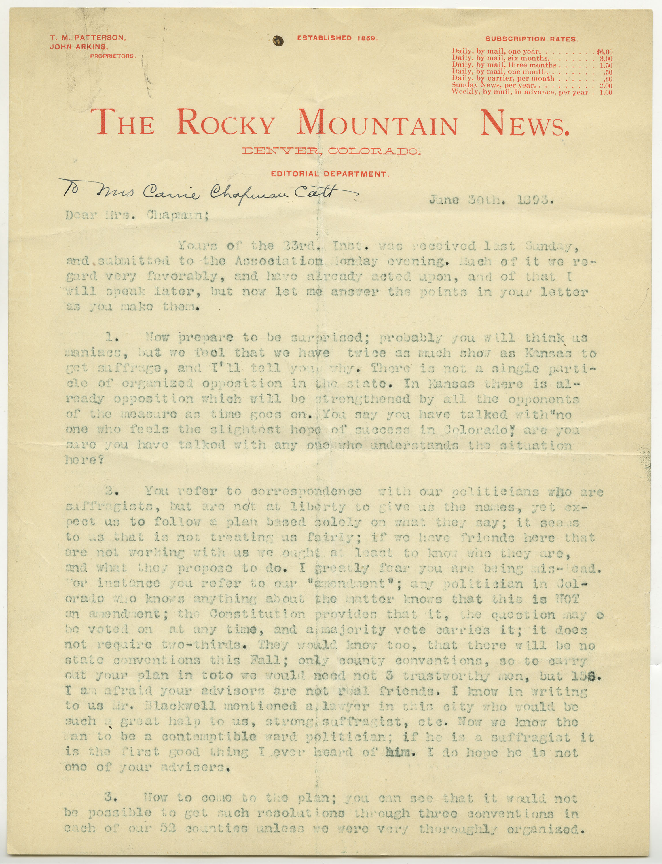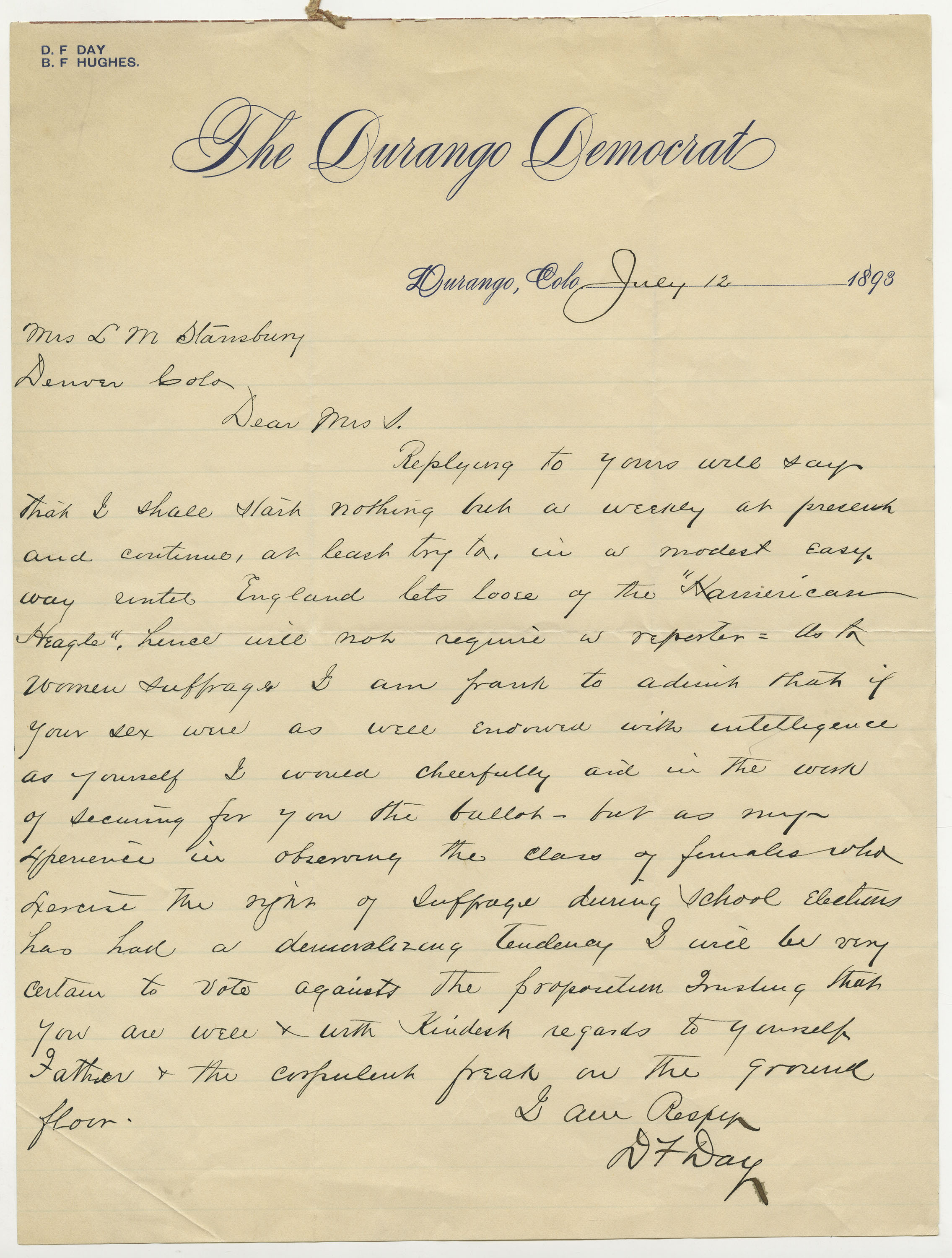 "The Durango Democrat \ Durango, Colo July 12 1893 Mrs. LM Stansbury Denver [---] Dear Mrs. S. Replying to yours will say that I shall start nothing but a weekly at present and continue, at least try, in a modest easy way...As to women suffrage I am frank to admit that if your sex were as well endowed with intelligence as yourself I would cheerfully aid in the work of securing for you the ballot - but as my experience in observing the class of females who exercise the right of suffrage during school elections has had a demoralizing tendency I will be very certain to vote against the proposition. Trusting you are well and with kindest regards to yourself, Father and the corpulent freak on the ground floor. I am Respectfully DF Day