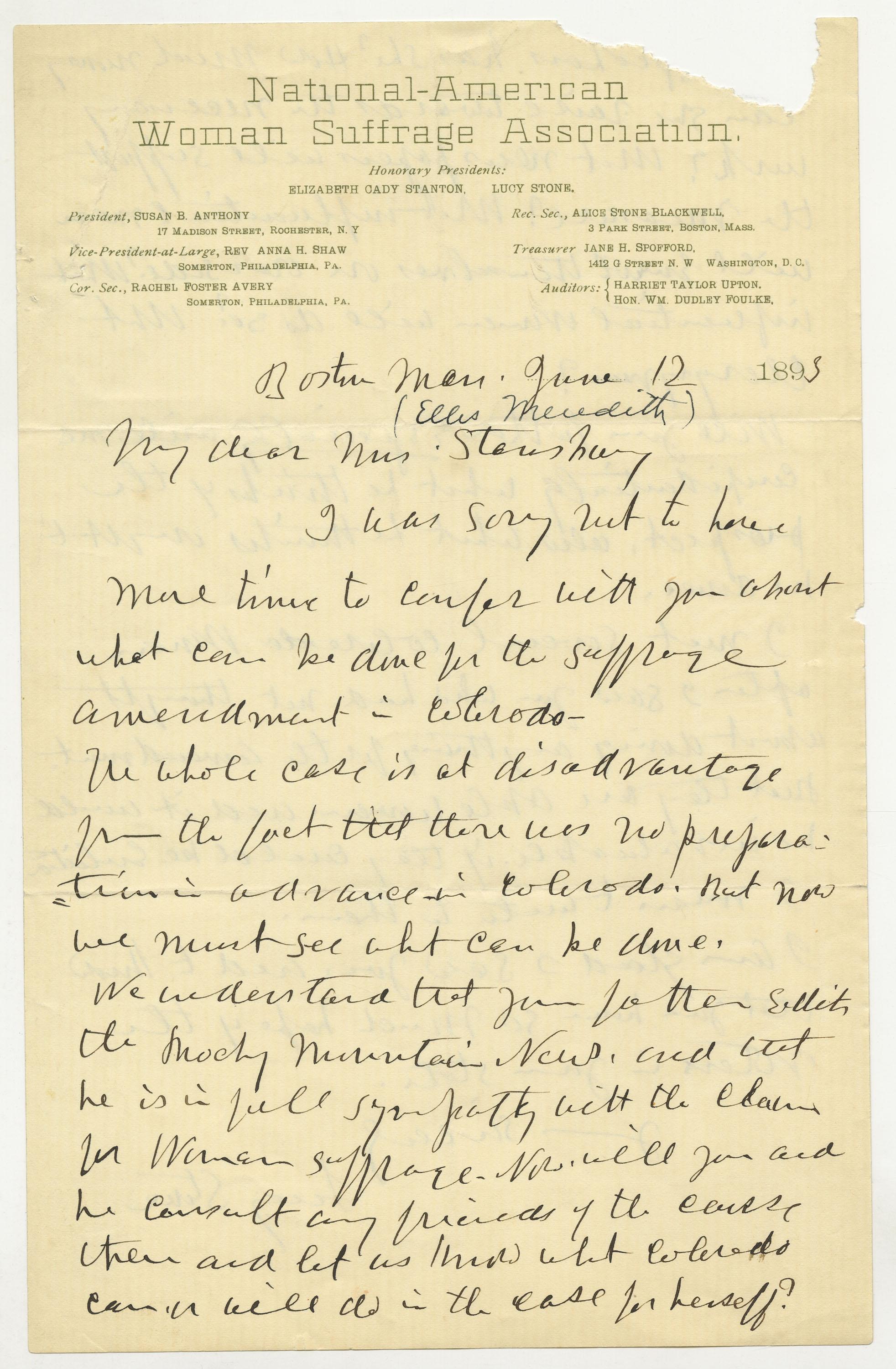 Boston Mass. June 12 1895 - My dear Mrs. Stansbury, I was sorry not to have more time to confer with you about what [should] be done for the suffrage amendment in Colorado. The whole case is at a disadvantage from the fact that there was no preparation in advance in Colorado. But now we must see what can be done. We understand that your father edits the Rocky Mountain News, and that he is in full sympathy with the cause for Woman suffrage. [--] will you and he consult any friends of the cause then and let us know what Colorado can and will do in the case for herself?”...