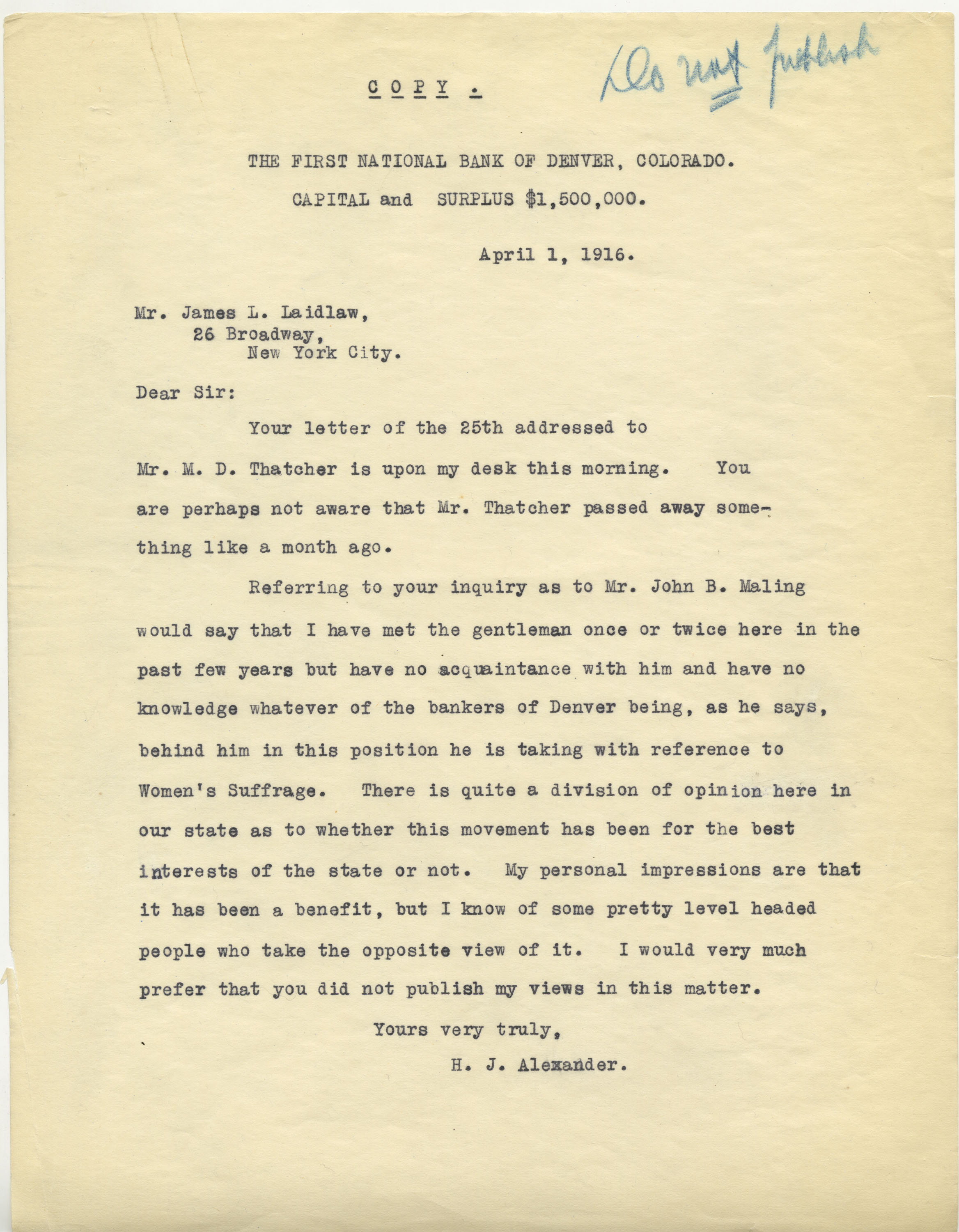 Because Colorado was an early adopter of suffrage, as the issue continued to grow throughout the country the state became the subject of scrutiny as to how women had impacted politics. A minor scandal was caused by one J.B. Mailing, who claimed to be associated with the business community of Denver. He blamed Colorado’s labor strife, including the Ludlow Massacre, on women voters. Suffragists on the national scale reacted quickly, soliciting letters of support from various “leading men of Denver.” Among the seventeen pages of supporting letters, some specifically say not to publish them. In the nineteenth-century equivalent of “please delete this text,” Hugh J. Alexander of the First National Bank of Denver said that he didn’t know of Mr. Mailing well, and that: