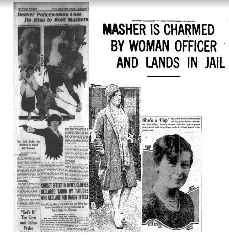 Left, March 6, 1921 Denver Post story about the formal jiu-jitsu and revolver training Officer Edith Barker received. Center: Barker escorts a kidnapping suspect off a train, 1931. Right: A portrait of Officer Barker in The Denver Post of June 10, 1928.