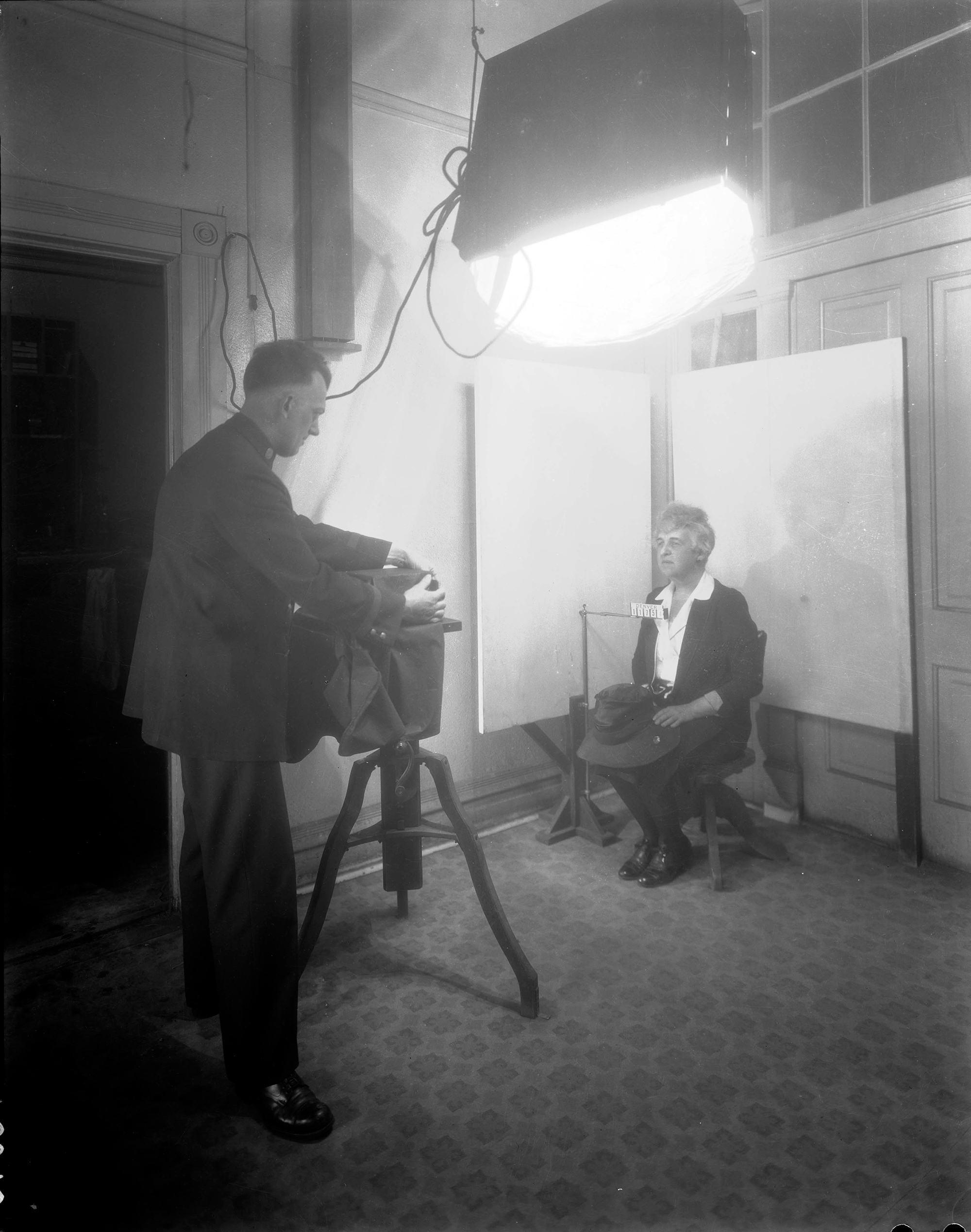 A woman sits for her mugshot after being taken in for violating Prohibition laws in Denver, 1920s.