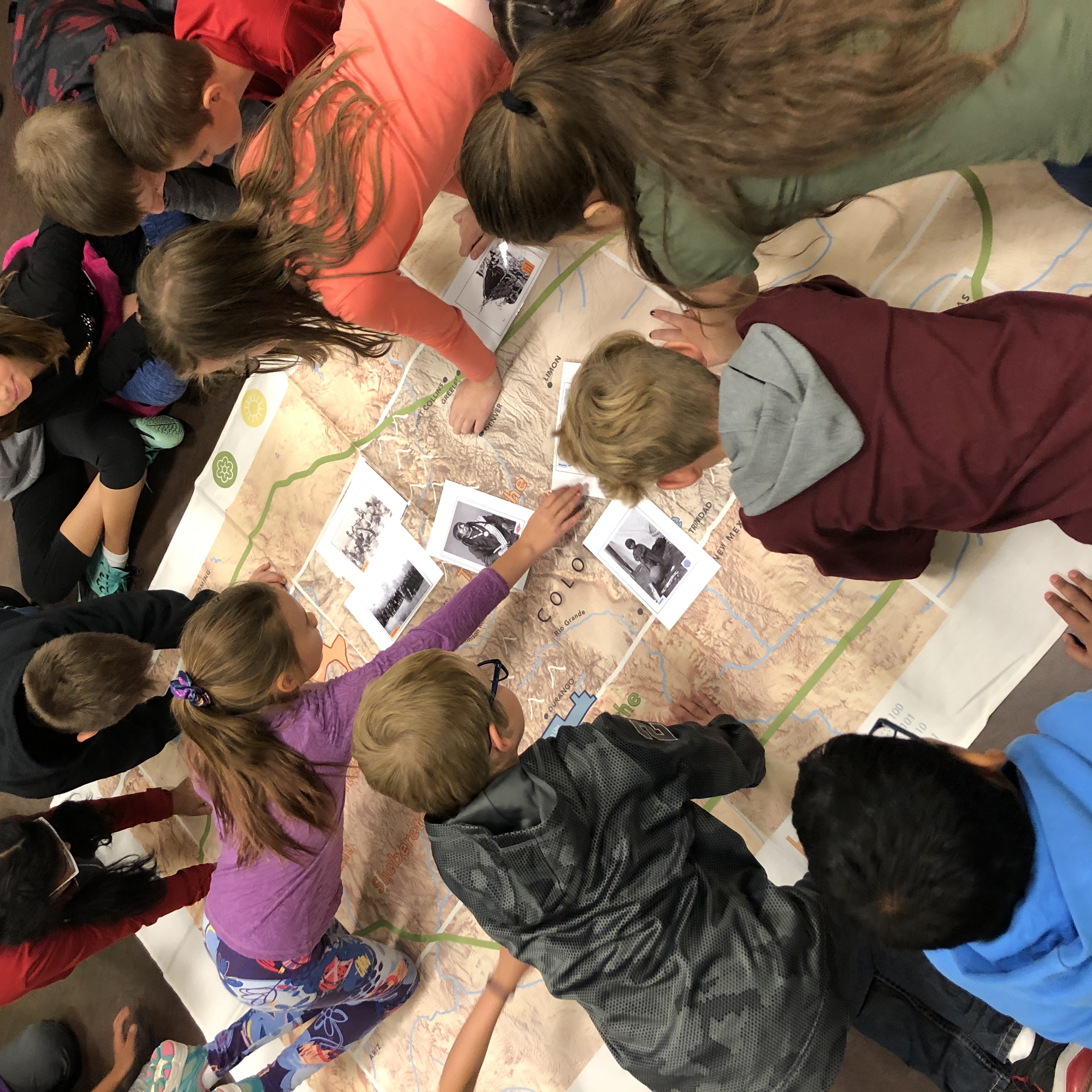 Students using the Ute STEM map on the floor. They are gathered around a map and comparing it to photos.