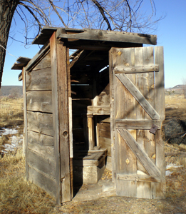 In Colorado, the state health department organized WPA privy construction and distribution, with centralized production and a multi-county regional distribution. While nearly every county had a sanitation project, the WPA did not record specific locations for each privy they placed. These privies arrived at “individual homes, farms, school buildings, dairies, filling stations, tourist camps, and many public places.”2 The standardized design made it easier for the WPA to mass produce these concrete vault sanitary privies, which also makes them easier to identify today. Some of the venting systems differ, but typically the vent is formed by a square wood shaft in the form of a T, terminating in screened holes on the sides of the privy walls. The greatest variety in WPA privies is in their wall cladding, where sometimes the regional production facility opted for horizontal clapboard rather than the standard vertical boards. In the San Luis and Huerfano valleys, the WPA privies are the reverse of the standard plan, placing the entrance door on the left and the pot on the right. The combination of interior and exterior features helps to differentiate the WPA privy from other types of privies that are still extant on the landscape.